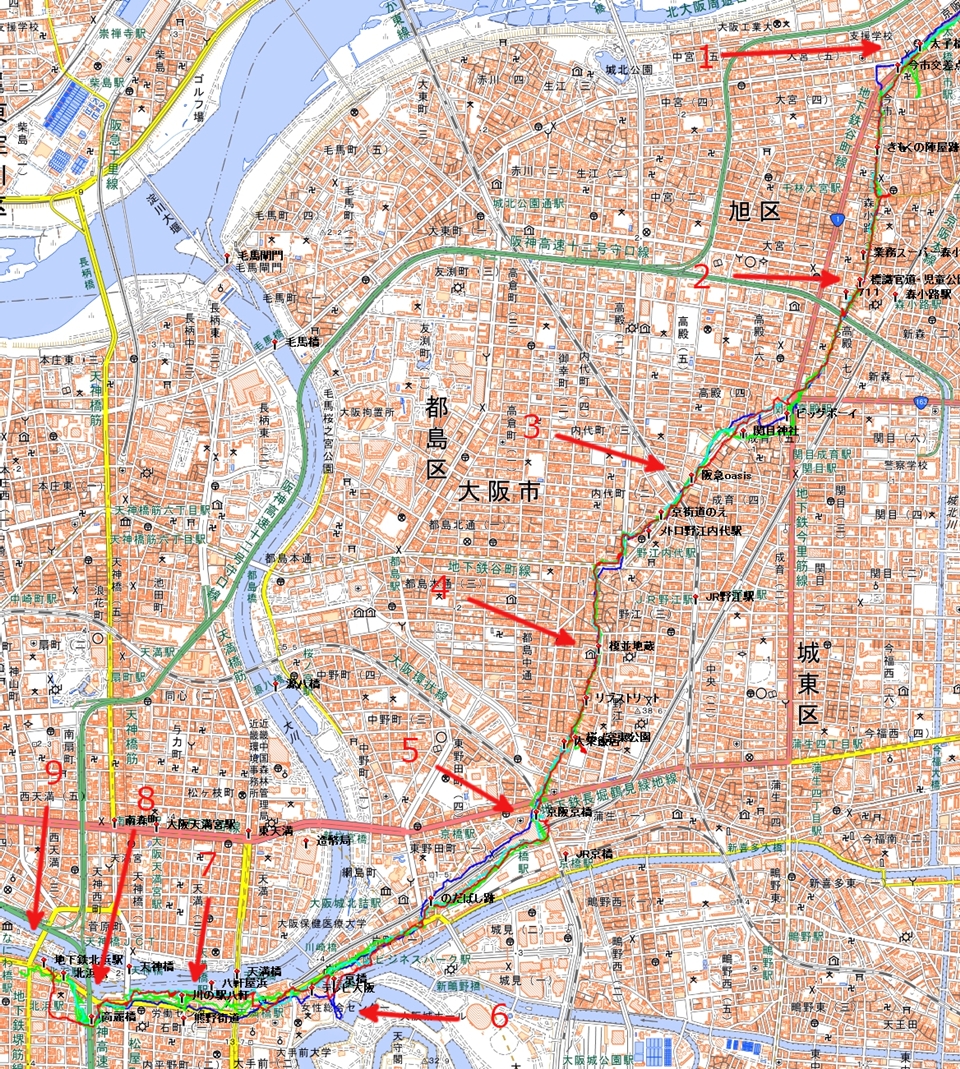 | コースタイム 944太子橋今市駅① 1008-1023児童公園② 1044阪急OASIS③ 1115榎並地蔵④ 1129-1207桜の宮運動公園 1214-1223京阪京橋T⑤ 1248テレビ大阪横ベンチ⑥ 1309-1323はちけんやT⑦ 1329高麗橋⑧ 1340地下鉄・北浜駅⑨ |