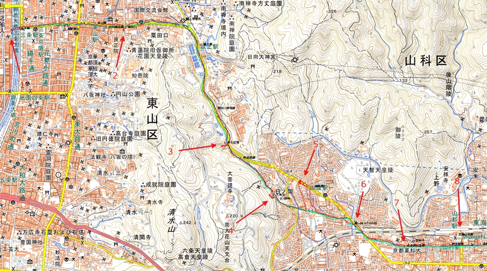 | コースタイム 956三条京阪① 1030粟田口② 1109-1117車石広場③ 1145-1153大乗寺・酔芙蓉鑑賞④ 1208-1258御陵駅近辺食堂・昼食⑤ 1309みどりの径⑥ 1325五条別れ道標⑦ 1347山科駅⑧ この地図の作成に当たっては、国土地理院長の承認を得て、同院発行の数値地図25000(地図画像)及び数値地図50mメッシュ(標高)を使用したものである。(承認番号 平17総使、第290号) |