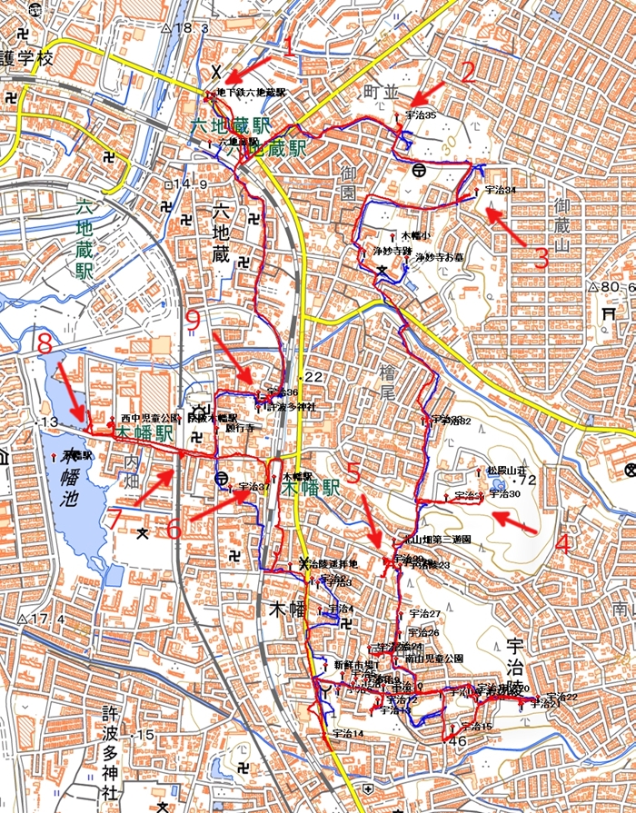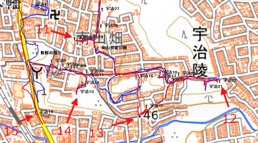 | コースタイム 1018宇治陵25号⑪ 1032宇治陵22号⑫ 1040宇治陵15号⑬ 1050宇治陵13号⑭ 1057宇治陵14号⑮ 以下 上のマップに続く |