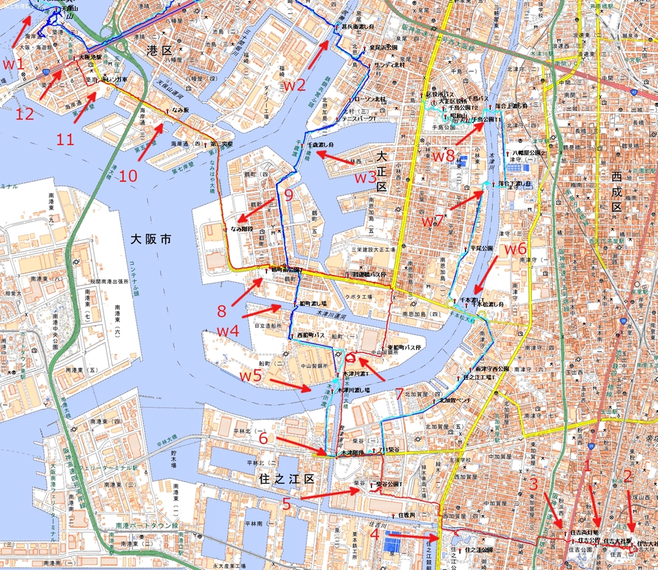 | コースタイム 1018住吉大社駅① 1020-1040住吉大社② 1051住吉大社高灯篭③ 1107住之江公園④ 1124柴谷公園T⑤ 1150新木津川大橋・南階段⑥ 1220ループ北⑦ 1253-1300鶴町南公園⑧ 1310なみはや大橋・南階段⑨ 1334北・スロープ⑩ 1354大阪港駅⑫ ⑪ 赤レンガ建物 この地図の作成に当たっては、国土地理院長の承認を得て、同院発行の数値地図25000(地図画像)及び数値地図50mメッシュ(標高)を使用したものである。(承認番号 平17総使、第290号) W1からW8は8つの渡し場です。青い軌跡が8つの渡し場巡りのコースです今回のなぎさ海道と関係あるところだけ紹介すると、W5の木津川渡しに新木津川大橋がある。南側が階段で北側がループとなっている。 なみはや大橋は南が階段、北は緩い勾配の坂となっている。いずれの橋も自転車での上り下りや走行は可能。 なみはや大橋から東に見える青い橋は千歳橋でここも千歳渡しW3がある。 なみはや大橋の西にある赤い長い橋は港大橋という。地図では緑の道路で示されている。 なみはや大橋の西にさきしまコスモタワーU(府庁 55階建て)が目立つ いずれの大橋からもあべのハルカスはよく見える |