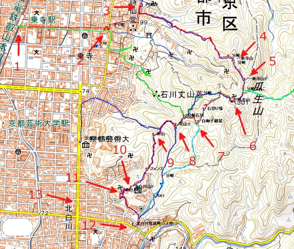 足裏の異常と内反小趾の被害を懸念し、一乗寺山のみで下山のつもりだったが、途中下山は急坂だとか、諸事情から終えてみれば結局のところ北白川まで予定のコースを行くことになった。