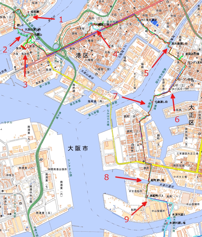 | コースタイム 954桜島駅① 1010-1038天保山渡し② 10478-1127天保山大観覧車③ 1120-1242八幡屋公園・昼食④ 1313-1322甚兵衛渡し⑤ 1341-1354テニスパーク・休憩⑥ 158-1404千歳渡し⑦ 1428-1444船町渡し⑧ 1448西船町バス停⑨ バス時間まで30分待ち この地図の作成に当たっては、国土地理院長の承認を得て、同院発行の数値地図25000(地図画像)及び数値地図50mメッシュ(標高)を使用したものである。(承認番号 平17総使、第290号) |